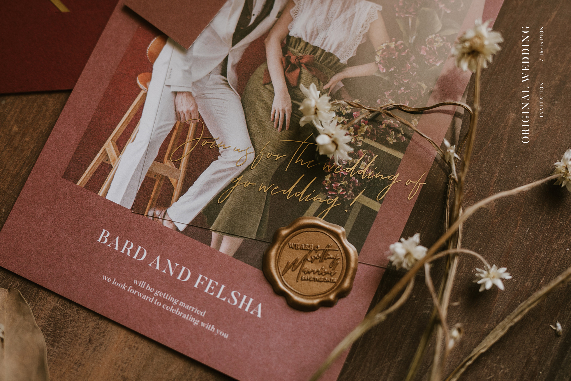 Content 內容物/ 單張明信片 + 透明燙金卡 + 緞帶 + 文字吊卡 + 金邊信封 + 封蠟貼紙